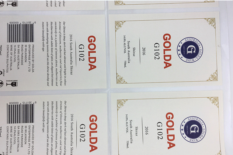 产品名称:酒类不干胶标签纸 颜色:单色、四色、专色 使用胶型:油胶、水胶、热熔胶 规格:根据客户自己定制 形状:圆形、长方形、椭圆形、自定义形状等 使用底纸:黄色离型纸,白色离型纸,白色格拉辛等 材质:镜面不干胶,PVC不干胶,易碎纸,铜板不干胶,牛皮纸等