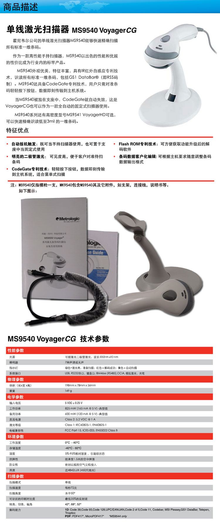 霍尼韦公司的单线激光扫描器MS9540能够快速精确扫描所有标准一维条码。作为一款高性能手持扫描器,MS9540以出色的性能和有约的性价比成行业内的产品。