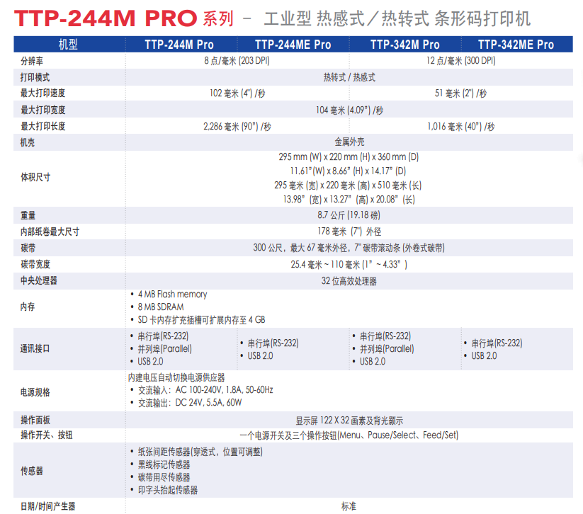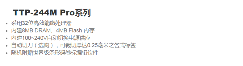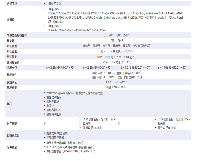 采用32位高效能微处理器 内建8MB DRAM、4MB Flash 内存 内建100~240V自动切换电源供应 自动切刀(选购),可裁切厚达0.25毫米之各式标签 随机附赠世界级条形码卷标编辑软件
