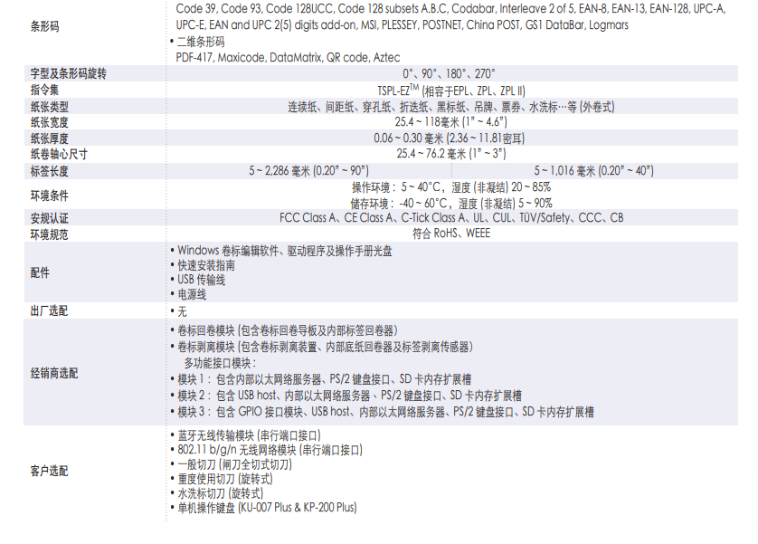 多款选购配件:内建式乙太网路伺服器、USB host 可搭配键盘或扫描器、标签剥离模组、标签回卷模组