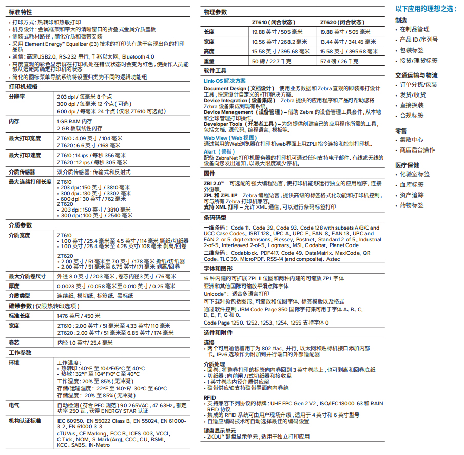 Zebra的工业打印机以其出色的耐用性、超快的打印速度、长使用寿命以及的可靠性闻名于世。ZT610 和 ZT620 以这些传统优势为基础构建而成,具备 Zebra工业打印机系列全面的先进特性。为了在广泛的应用中确保关键运营顺畅运转,ZT600系列打印机可提供: